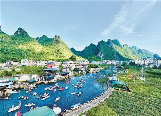 现代服务业在“山水”中释放动能。依托“澄江国家湿地公园”“地下河国家地质公园”等优质资源,建成国家4A级旅游景区4家,3A级旅游景区3家,广西生态旅游示范区2家,打造“天窗”“花河”等文旅品牌,龙布日出、凤塘云海成为网红打卡点。2024年接待游客突破400万人次,实现旅游消费超40亿元,让第三产业以61.5%的GDP占比成为县域经济增长的重要引擎,是名副其实的全国热门小众旅游目的地。构建县、乡、村三级电子商务服务体系,打通特色农产品线上销售渠道,荣获“国家电子商务进农村综合示范县”,都安牛羊、旱藕粉丝等农特产品走俏全国,“指尖经济”激活乡村振兴新潜能。