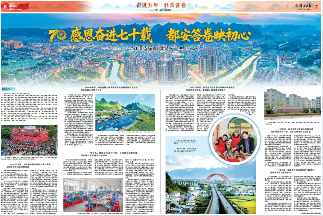都安的70年巨变,是民族区域自治制度的成功实践,是推进中华民族共同体建设的生动写照,是中国共产党领导下县域发展的精彩缩影。从1955年12月自治县成立掀开历史新篇,到如今荣获“广西县域经济高质量发展进步县”“广西科学发展进步县”“广西全域旅游示范区”等诸多殊荣,都安用70年时光书写了一部民族团结、脱贫攻坚、产业崛起、民生改善的壮丽史诗,交出了一份无愧于时代、无愧于人民的优异答卷。