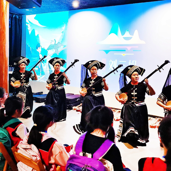 ▲刘三姐文化印象博物馆里,演员们向游客展示壮族天琴艺术。