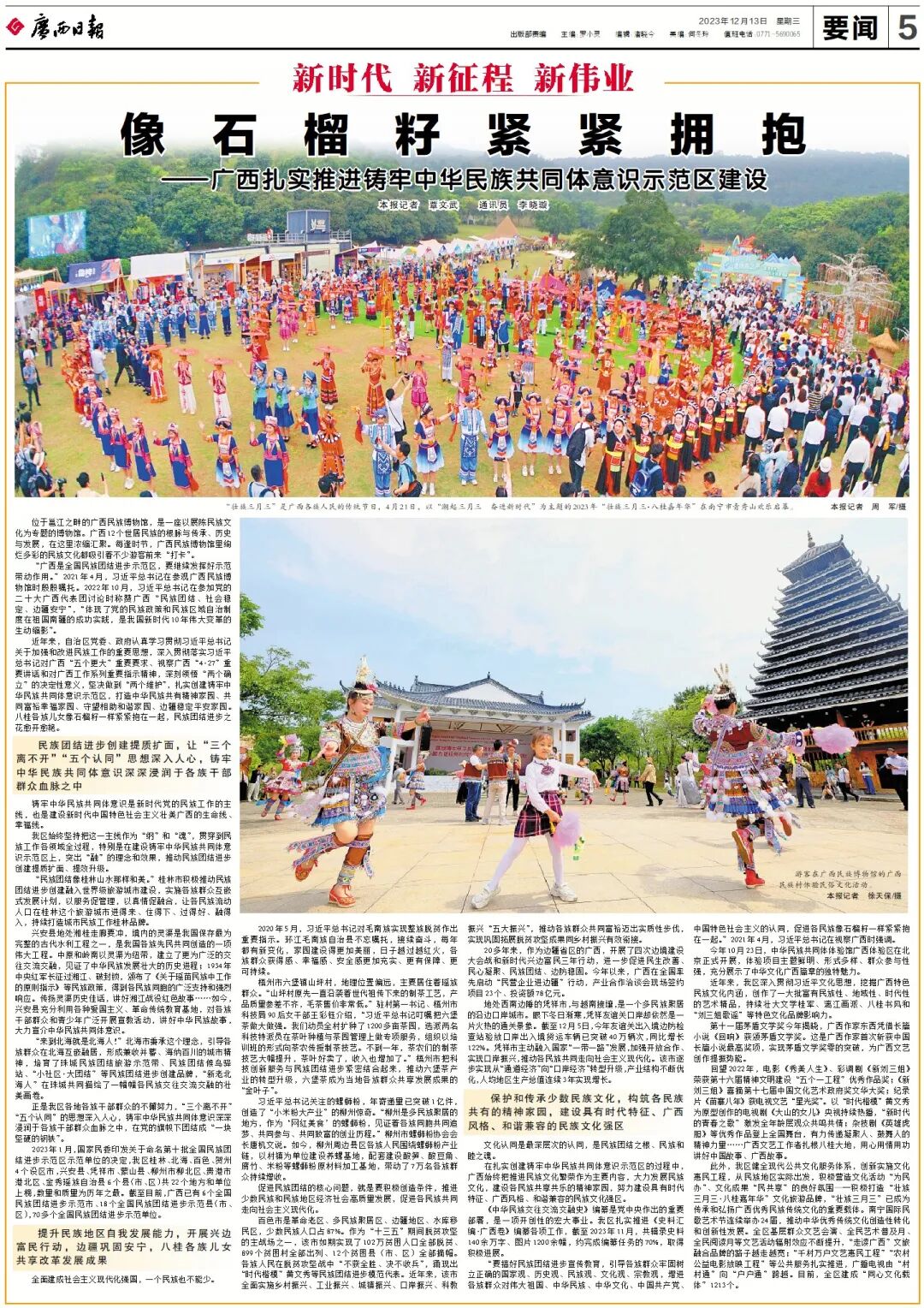 在扎实创建铸牢中华民族共同体意识示范区的过程中,广西始终把推进民族文化繁荣作为主要内容,大力发展民族文化,建设各民族共享共乐的精神家园,努力建设具有时代特征、广西风格、和谐兼容的民族文化强区。