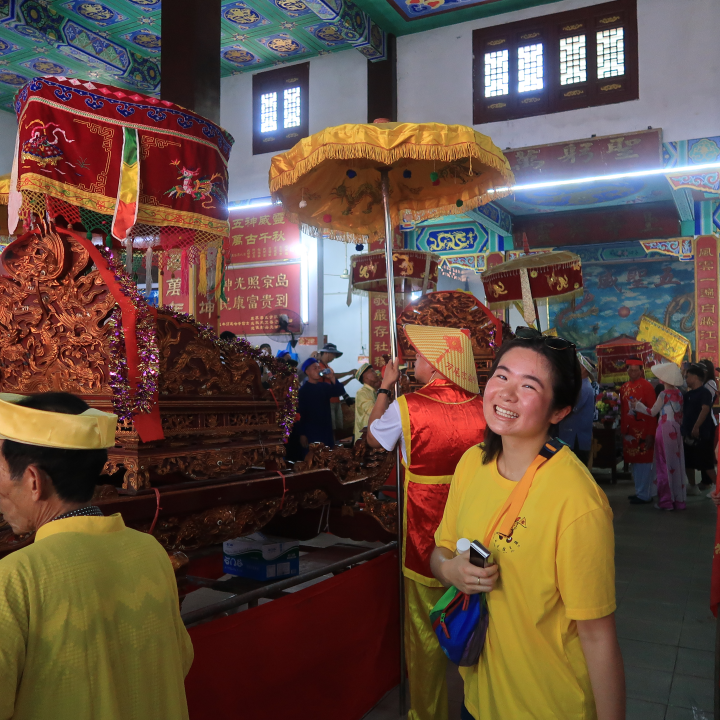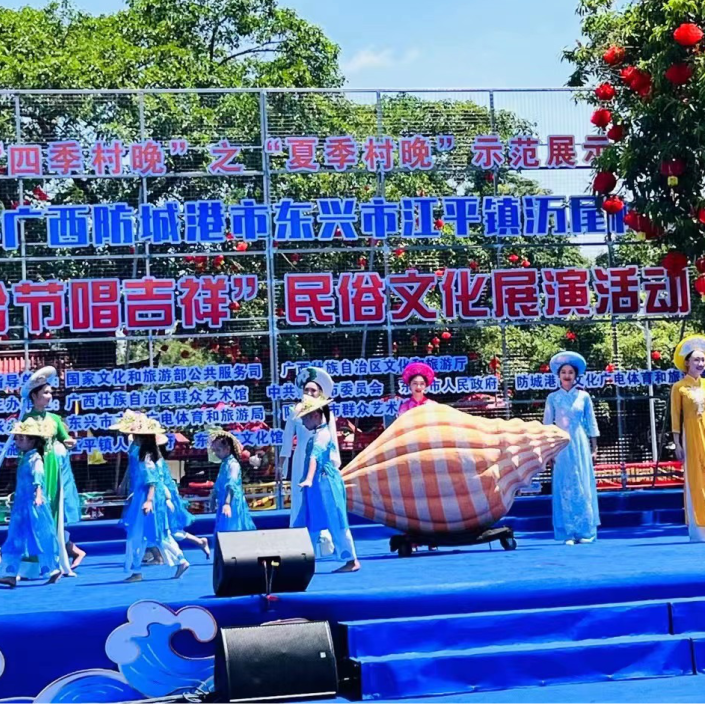 每年农历六月初九,是防城港市东兴市江平镇万尾村京族人民的传统节日,同时也是国家首批非物质文化遗产之一——“哈节”。作为京族人民一年一度最盛大的传统节日,万尾岛上众多游客齐聚,“哈节”现场热闹非凡。营员们跟随队伍迎神、祭神、入席等,在淳朴奇特的仪式中感受独属于港城、独属于京族的民俗风情。随后,营员们还观看了“京族哈节唱吉祥”民俗文化展演。独具风情的特色节目,将现场氛围烘托至极点,也给华裔青少年们留下深刻印象。