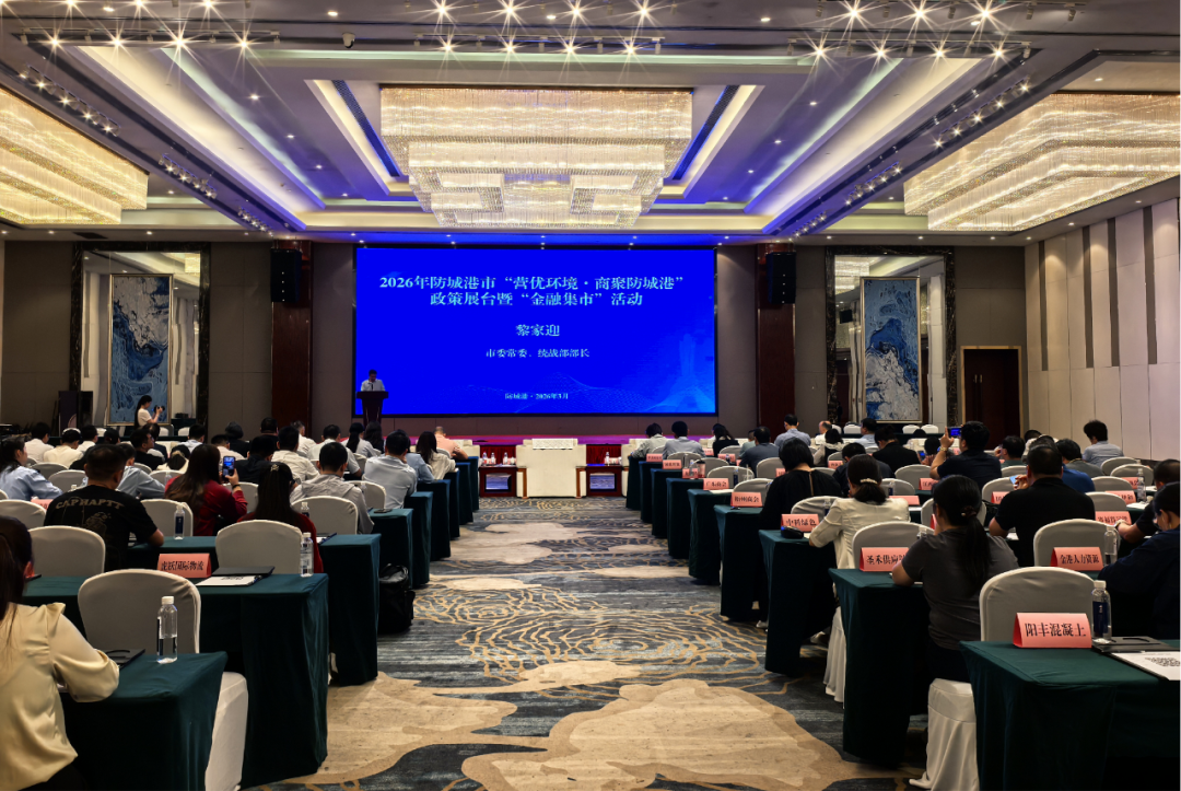 3月24日下午,2026年防城港市“营优环境·商聚防城港”政策展台暨“金融集市”活动在荣兴格朗大酒店举行。市委常委、统战部部长黎家迎出席活动并讲话,市相关部门、金融机构及企业代表约120人参加活动。