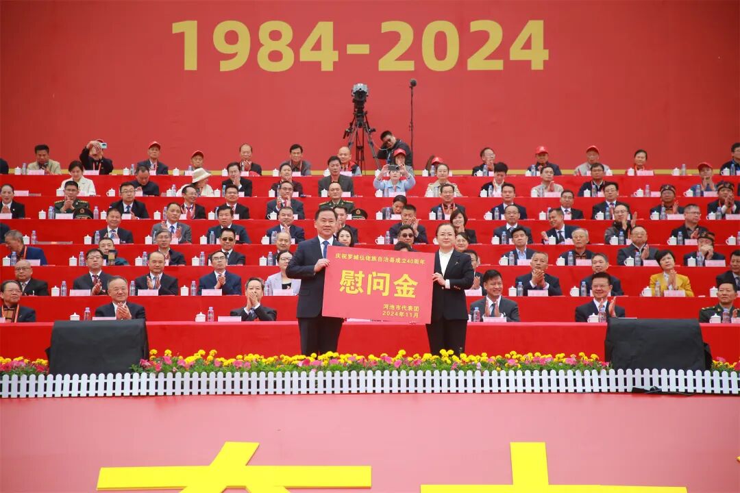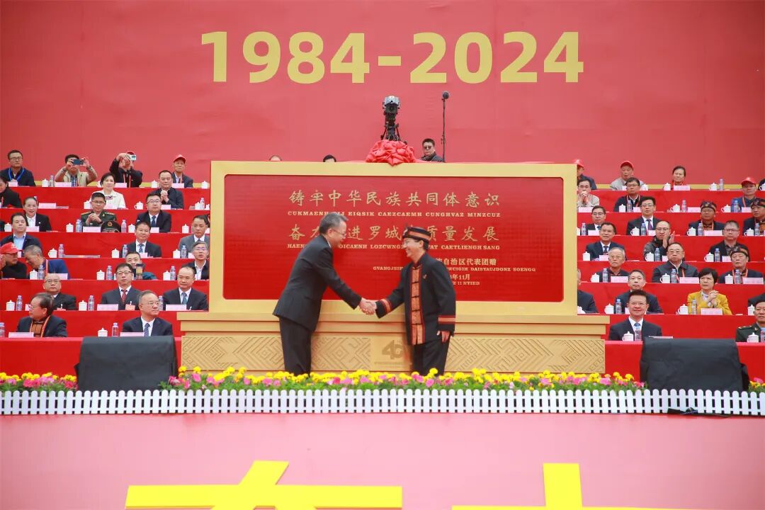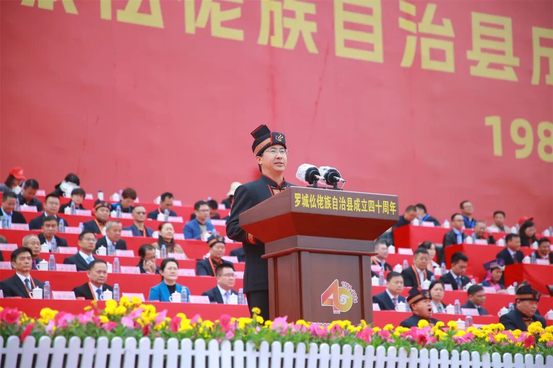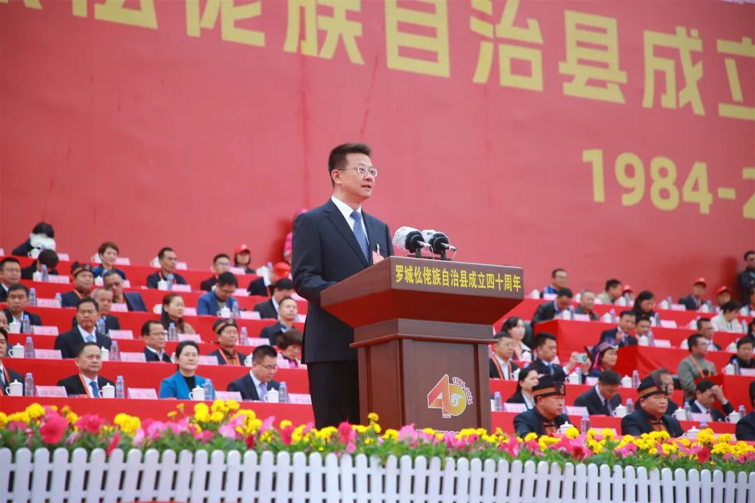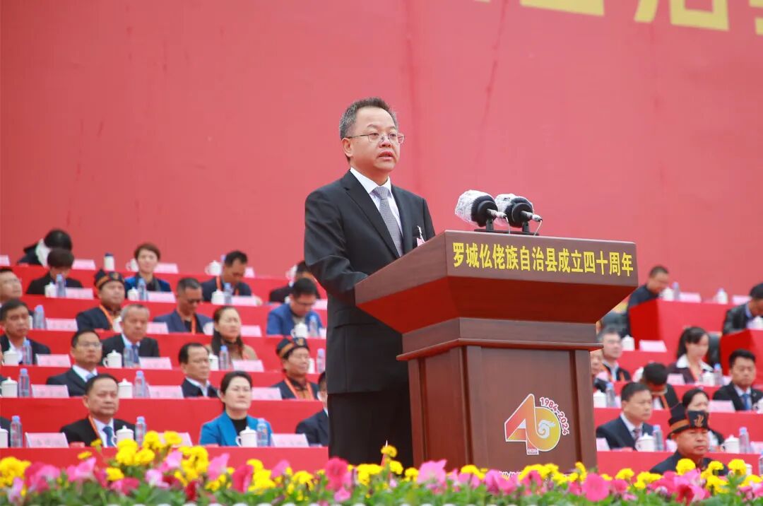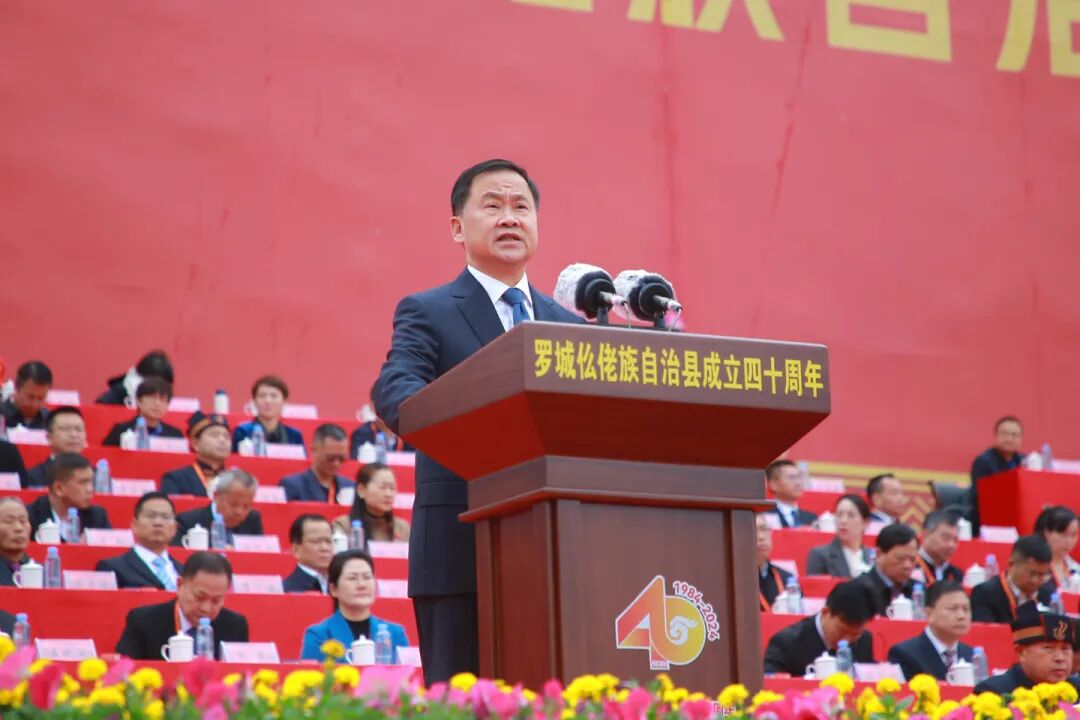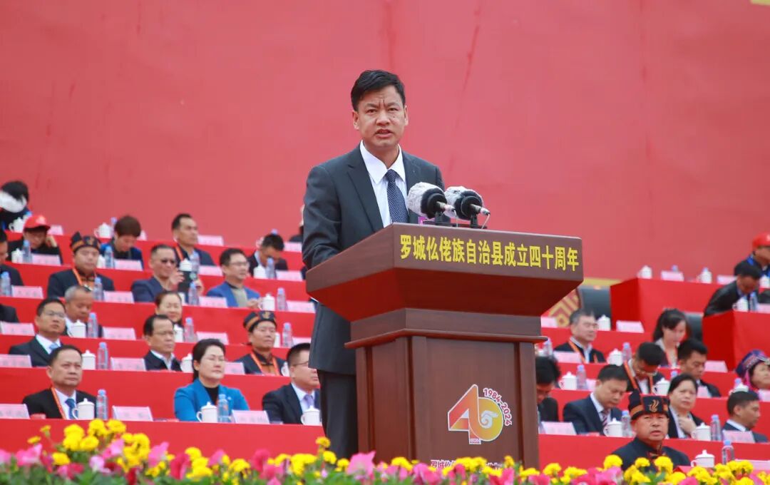 王心富代表自治区党委、自治区人大常委会、自治区人民政府、自治区政协、广西军区和全区各族人民,向罗城各族群众表示祝贺。王心富指出,40年来特别是党的十八大以来,罗城各族人民砥砺奋进、踔厉奋发,经济发展蓬勃兴旺,城乡面貌焕然一新,绿色发展底色亮丽,民生福祉日益改善,民族团结持续巩固,取得了辉煌成就。希望罗城各族干部群众始终坚持以习近平新时代中国特色社会主义思想为指导,深入学习贯彻党的二十大和二十届二中、三中全会精神,全面贯彻落实习近平总书记关于加强和改进民族工作的重要思想和关于广西工作论述的重要要求,坚持和加强党的全面领导,践行以人民为中心的发展思想,按照建设铸牢中华民族共同体意识示范区的部署要求,积极推进“五个家园”建设,加快推动经济社会高质量发展,在奋力谱写中国式现代化广西篇章中展现新作为、作出新贡献。