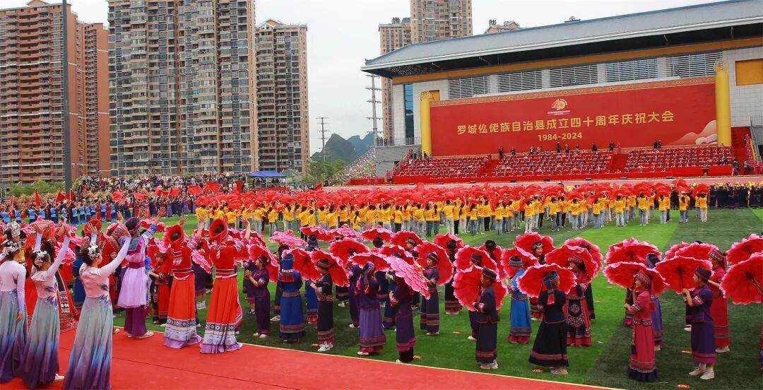 县庆活动紧扣铸牢中华民族共同体意识主线,内容丰富多彩,庆祝大会结束后举行了自治县成立40周年成就展、群众文艺表演和县庆文艺晚会等系列活动,全方位展示40年来罗城经济社会发展成就。