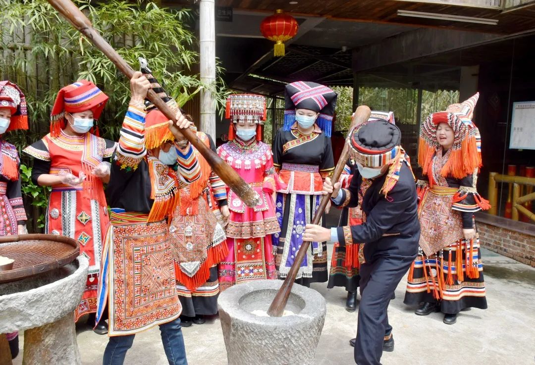 为造健康生活方式与养生理念,倡导“低碳、健康、环保”理念,吴依臻为大家介绍了以绿色健康为主的台湾美食,如花莲时令的箭笋、野窖头等等台湾素食佳肴,相似的饮食习惯、文化风俗引起了在场同胞的共鸣。随后,李素芳带领瑶族同胞现场摏糍粑,这是台湾同胞在贺州体验时最喜欢的一项活动,现场浓厚的氛围也勾起了大家在贺州一起生活的美好回忆,阿美同胞纷纷表示,疫情结束后一定要回家看看,一起摏糍粑。
