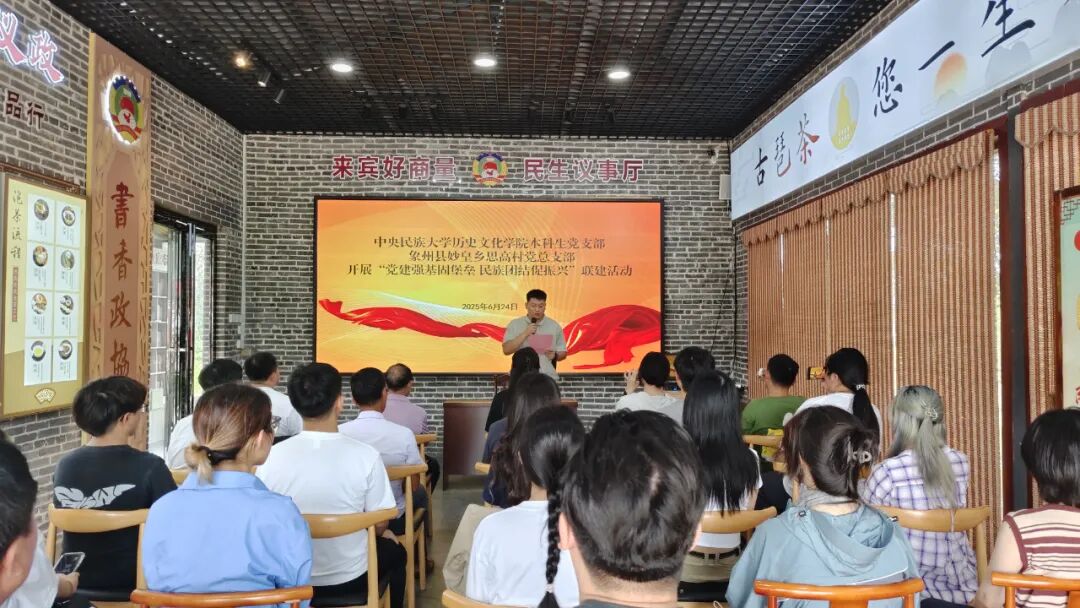 在象州县妙皇乡思高村,中央民族大学历史文化学院本科生党支部与象州县妙皇乡思高村党总支部开展“党建强基固堡垒,民族团结促振兴”联建活动,一同重温入党誓词,相互介绍校地发展情况,并围绕特色农产品品牌策划和宣传、文化资源挖掘等展开讨论。