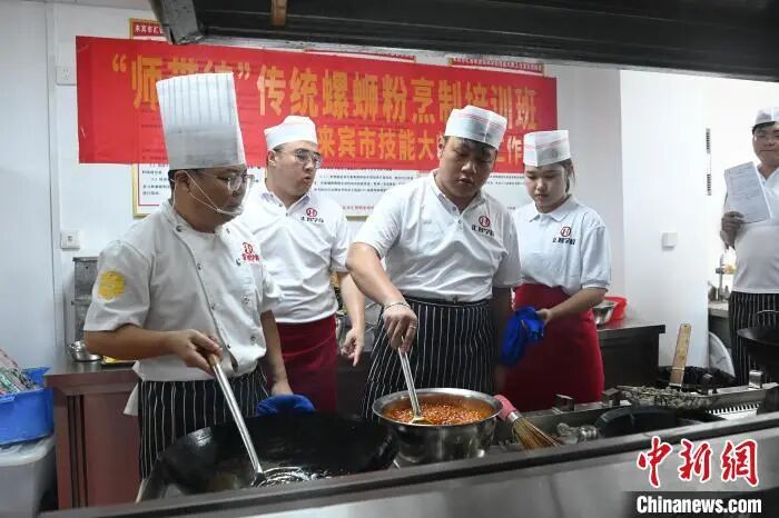 7月7日,陈永翔(左三)在培训师指导下烹饪螺蛳粉的辣椒油。中新社记者 蒋雪林 摄
