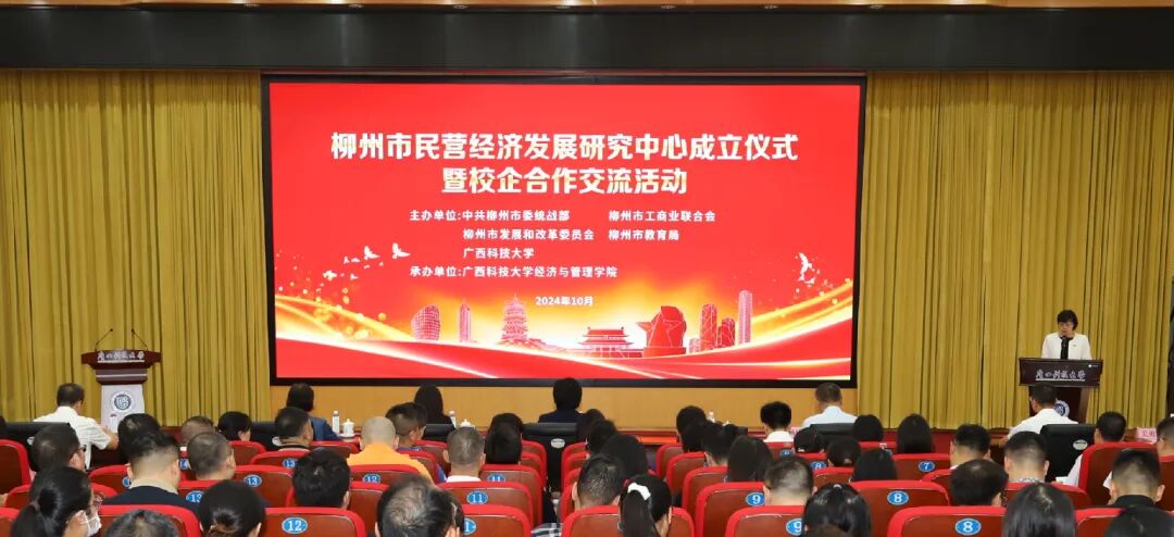 为深入贯彻党的二十届三中全会精神,高质量促进民营经济“两个健康”,10月18日,柳州市委统战部、市发改委、市教育局、市工商联、广西科技大学联合举办柳州市民营经济发展研究中心成立仪式暨校企合作交流活动。市委常委、统战部部长,市政协党组副书记邓娟娟出席活动并讲话,市政协副主席、市工商联主席莫玉和主持活动,广西科技大学党委常委、副校长邓朗妮出席活动并致辞。