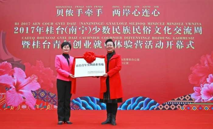 搭建实训就业基地,创造便利条件。搭建“桂台青年实训就业基地”等邕台院校合作基地,频繁之间的交流与合作,从而吸引台湾青年来邕就业创业。“桂台青年实训就业基地”于2017年3月落户南宁职业技术学院,依托南职院多年来为青年学生打造的良好创业条件。目前已举办“桂台(南宁)少数民族民俗文化交流周暨桂台青年创业就业体验营活动”。