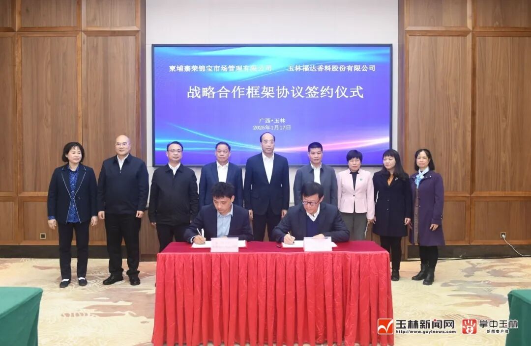 签约仪式上,柬埔寨荣锦宝市场管理有限公司分别和玉林福达香料股份有限公司、广西三环企业集团股份有限公司签订了战略合作框架协议。下一步,将充分发挥各自资源和专业优势,共同开拓柬埔寨“玉品出海”通道,既有利于助推更多“桂品出海”“玉品出海”,又为玉林与柬埔寨等东盟国家在经贸文化等多领域的交流合作注入新活力。