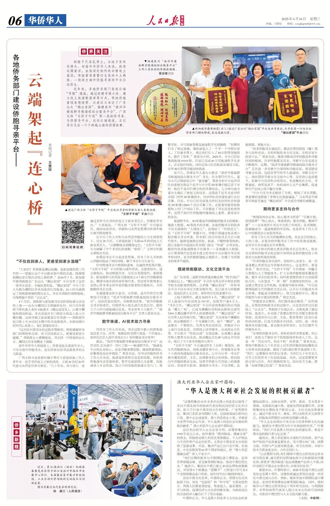 4月16日,人民日报海外版刊登文章《各地侨务部门建设侨胞寻亲平台——云端架起“连心桥”》,文章介绍了广西玉林“玉侨子午线”平台为侨胞寻亲成功经验,展现了玉林侨务部门运用数字平台破解海外侨胞寻亲难的创新实践。