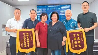 新加坡华裔黄映霞(右三)通过广东汕头“潮汕家园”平台成功寻亲后,与寻亲团一行向当地侨务部门赠送锦旗,表达感激之情。“潮汕家园”平台供图