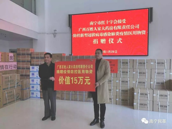 仪式上,南宁民革党员、广西百姓人家大药房有限责任公司董事长陈军捐赠总价值15万元的消毒、抗病毒药品等一批。