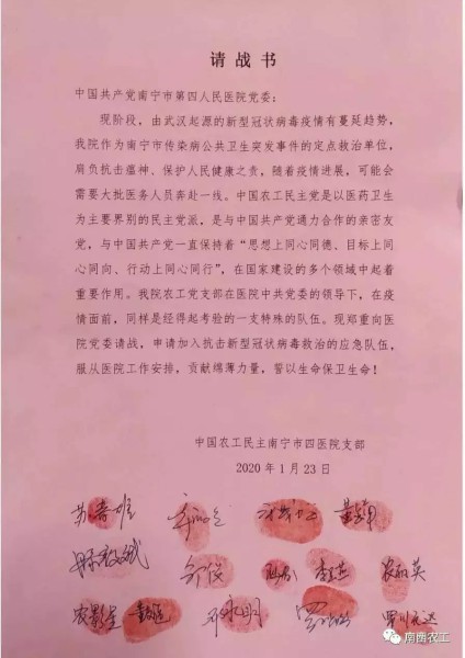 2020年的春节对于很多人来说注定会很难忘,在这场没有硝烟的战争面前,这封来自农工党南宁市第四人民医院支部的请战书让我们热泪盈眶。
