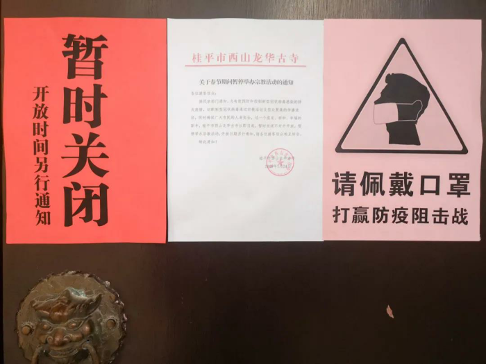 图为桂平西山龙华古寺张贴关闭场所、暂停举办宗教活动公告