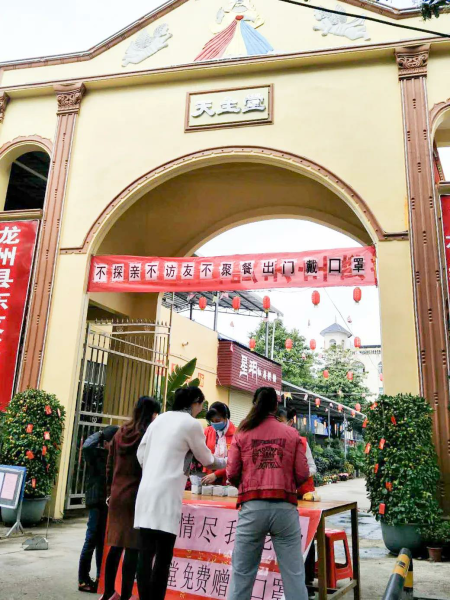 龙州县天主教堂工作人员为附近群众免费发放口罩