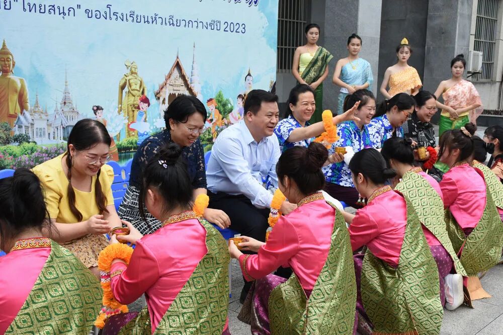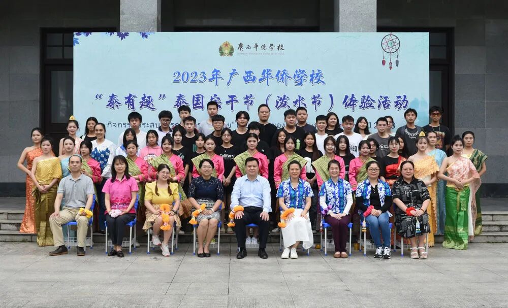 4月14日下午,广西华侨学校中泰学生齐聚学校南门广场,载歌载舞、泼水祝福,共同体验泰国的传统节日——宋干节。体验活动在广西华侨学校校长姚远忠的亲切问候和美好祝愿中拉开序幕。