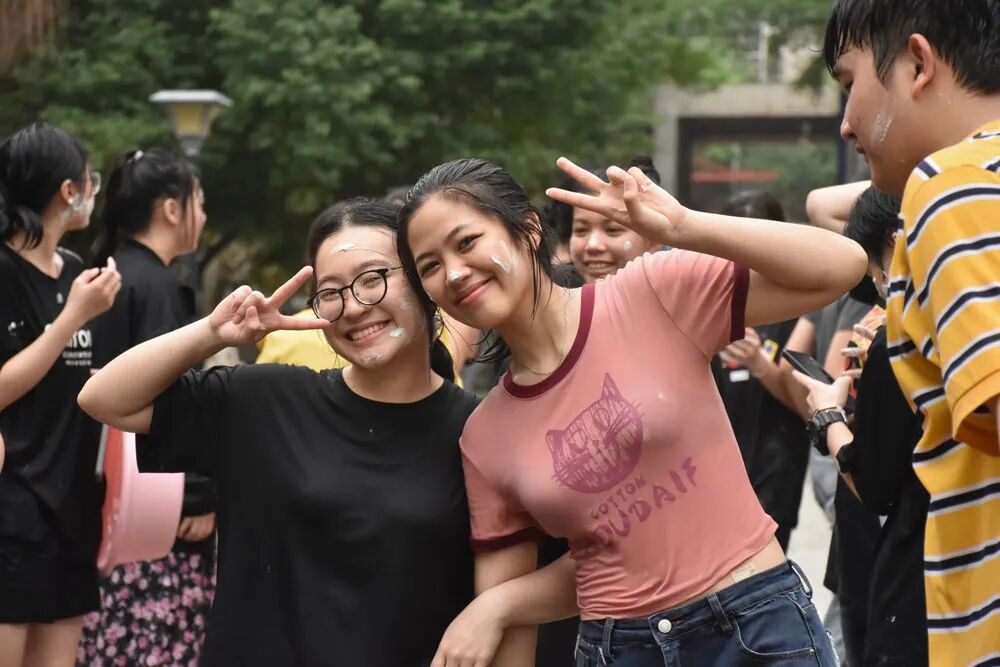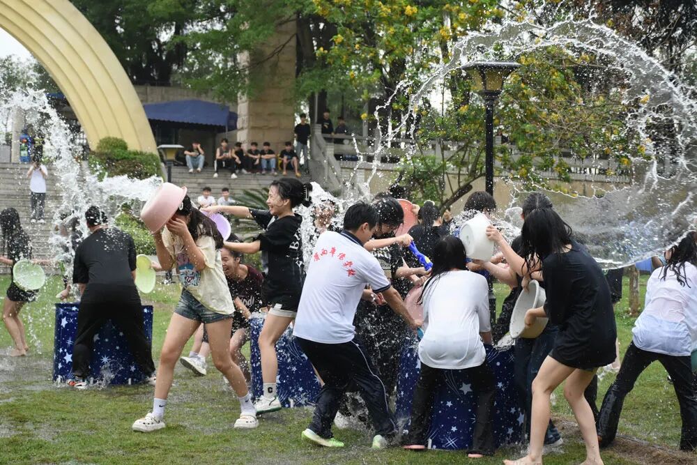 欢庆活动在欢快的音乐声和歌声中进入高潮——泼水狂欢环节。大家手持水盆、水桶、水枪玩得不亦乐乎。你追我赶,祝福的水花泼到人们的身上,每个人脸上都洋溢着幸福的笑容。大家还将香粉抹在彼此的脸上,送上美好的祝福,整个校园内充满了喜庆的节日气氛。