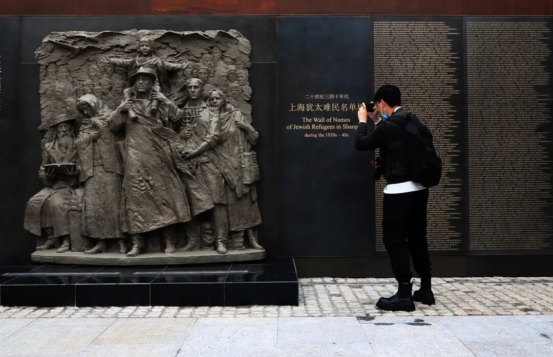 参观者拍摄上海犹太纪念馆外的浮雕。(资料图) 汤彦俊 摄