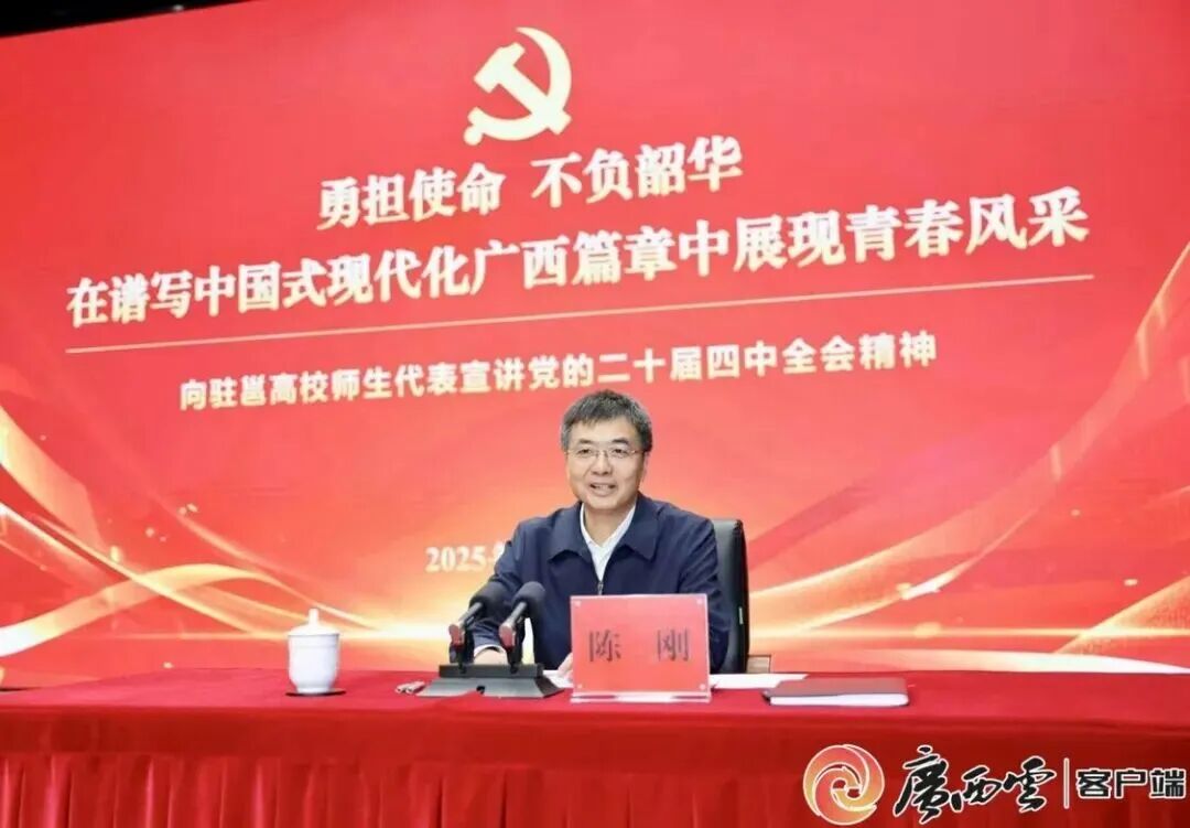 陈刚强调,自治区党委十二届十一次全会认真对标对表中央部署要求,紧密结合广西实际,对我区“十五五”发展进行谋划部署,为广大青年学子干事创业搭建了前所未有的广阔舞台。特别是大力发展人工智能,打造面向东盟的人工智能合作高地;全力打造有色金属及关键金属材料、先进钢铁材料、现代绿色化工、人工智能及新一代信息技术、机械及高端装备制造、新能源汽车及电池、食品加工、林产加工及纸业、生物医药及健康、绿色建材等制造业十大现代化支柱产业,进一步筑牢广西现代化产业根基;一体推进教育科技人才发展,加快建设高水平创新型广西,培育发展新质生产力;扩大面向东盟的开放合作,积极服务构建更为紧密的中国—东盟命运共同体;大力发展向海经济,走出一条具有广西特色的向海图强之路;建设铸牢中华民族共同体意识示范区,促进各民族交往交流交融;促进高质量充分就业;统筹建好政治生态、自然生态“两个生态”,等等。希望大家将个人理想融入时代洪流,找准定位、主动担当、大胆作为,努力在谱写中国式现代化广西篇章的宏大实践中绽放夺目的光芒。