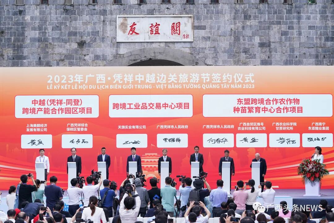 其中,在旅游节开幕式现场,共签约跨境工业品交易中心项目、中越(凭祥—同登)跨境产能合作园区项目、东盟跨境合作农作物种苗繁育中心合作项目等多个产业项目。