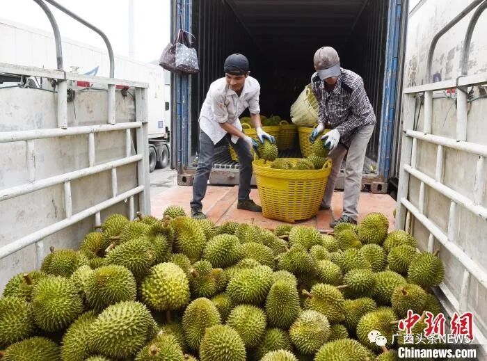 图为工作人员正在将进口榴莲与中国货车进行货物接驳。(资料图) 凭祥融媒体中心供图