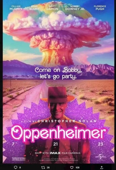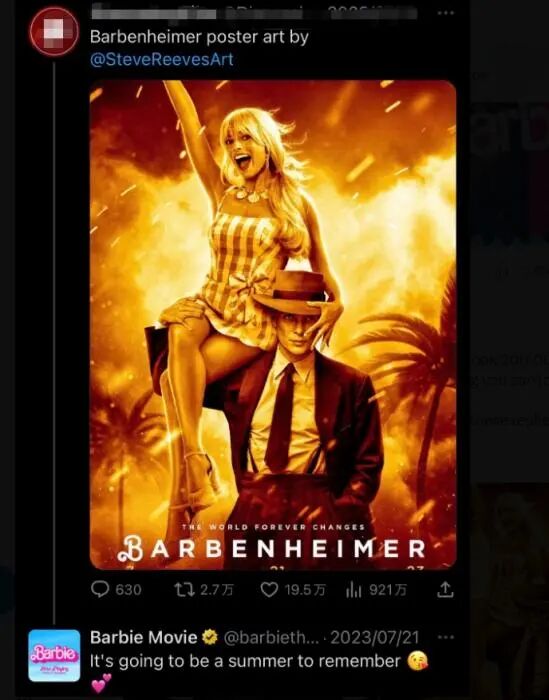 许多影迷将两部影片中主人公的名字“芭比”、“奥本海默”组合起来创造了一个新词——“芭本海默”(Barbenheimer)。此外,他们还在社交媒体上制作各种与#芭本海默#相关的恶搞梗图。
