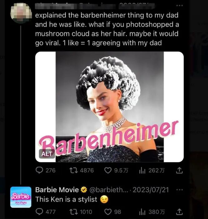 在另一则网友的玩梗推文中,演员罗比的头发被P成原子弹爆炸时产生的“蘑菇云”造型,《芭比》电影的官方账号则在推文下留言,“这个肯尼是一名造型师(“肯”在芭比世界中代指男性)”,文末还附上调皮眨眼的表情符号。