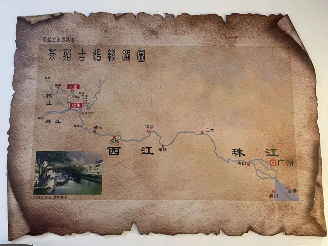 每年的产茶季,六堡茶就会在合口码头装货,沿六堡河而下,经过梨埠镇码头再换装上大木船,顺着东安江而下进入贺江,再经广东封开县江口镇进入西江,然后在郁南县都城镇换装大货船,运至广州,最后经由广州港出口至世界各地。新中国成立后,随着我国基础设施建设快速发展,六堡茶不再完全依托水路运输走向世界,茶船古道上的船商成为过去,六堡茶正以全新形象走进大众视野。
