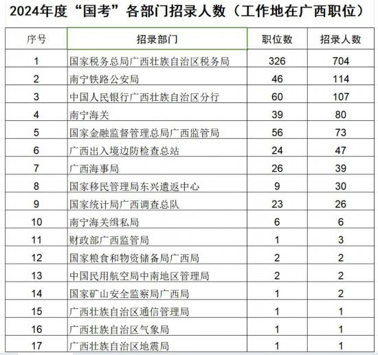 据职位表,工作地在广西的职位中,国家税务总局广西税务局招录人数尽管较上年度减少了96人,但仍有职位326个,招录704人,属招录人数最多的部门。南宁铁路公安局提供职位46个,招录114人,是需求人数第二多的“招录大户”。中国人民银行广西壮族自治区分行提供60个职位,招录107人,成为招录人数居第三名的部门,这也是该部门首次参加“国考”招录。其余各部门的招录人数,在1人至80人不等。