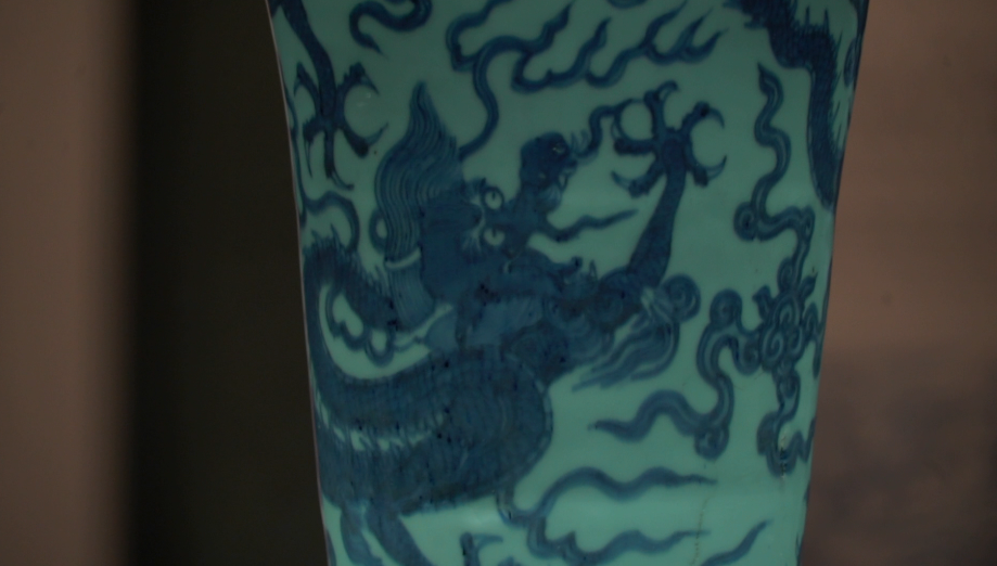 这件明万历哥釉五彩云龙纹梅瓶堪称独一无二的珍品。瓶身处绘有两条飞龙,一条凌云而上,一条俯冲云霄,周围还有红彩点缀,气势非凡,而最奇妙的是升龙的一足居然画了六爪。龙纹素有五爪为龙,四爪为蟒之说,在礼教严苛、等级森严的明代,这件“错版”工艺品能幸存至今十分难得。