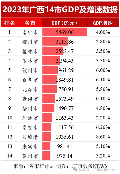 根据各市统计局公布的数据,多地的经济总量迈上新台阶,特别是首府南宁市的“顶梁柱”作用明显。南宁市成为广西首个经济总量突破5000亿元的设区市,2023年全市生产总值5469.06亿元,比上年增长4.0%,稳居全区第一。