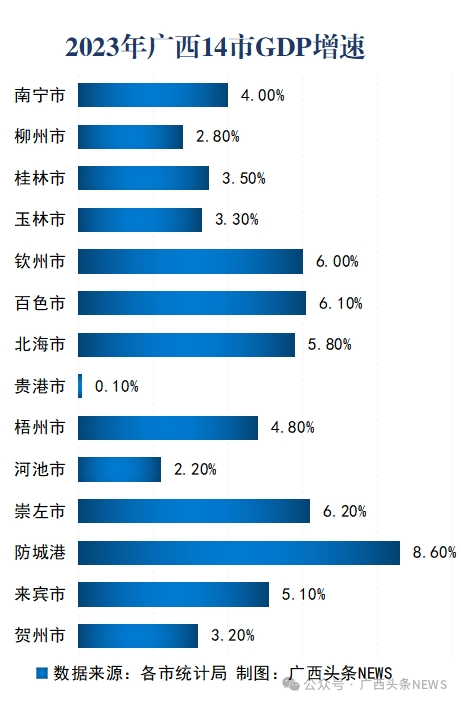 南宁、桂林、玉林、贺州、柳州、河池、贵港低于全区增速水平,其中,南宁比上年增长4.0%,桂林比上年增长3.5%,玉林比上年增长3.3%。