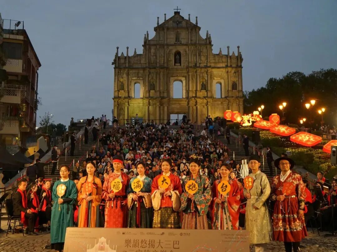 2025年2月12日,澳门中乐团在大三巴牌坊前举行“乐韵悠扬大三巴”元宵节音乐会。图为音乐会中的汉服展示环节。中新社记者 郑嘉伟 摄