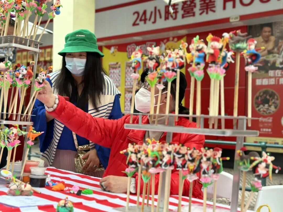 2023年1月23日,澳门新马路上的一家面塑技艺摊位吸引民众驻足。中新社记者 李亚南 摄