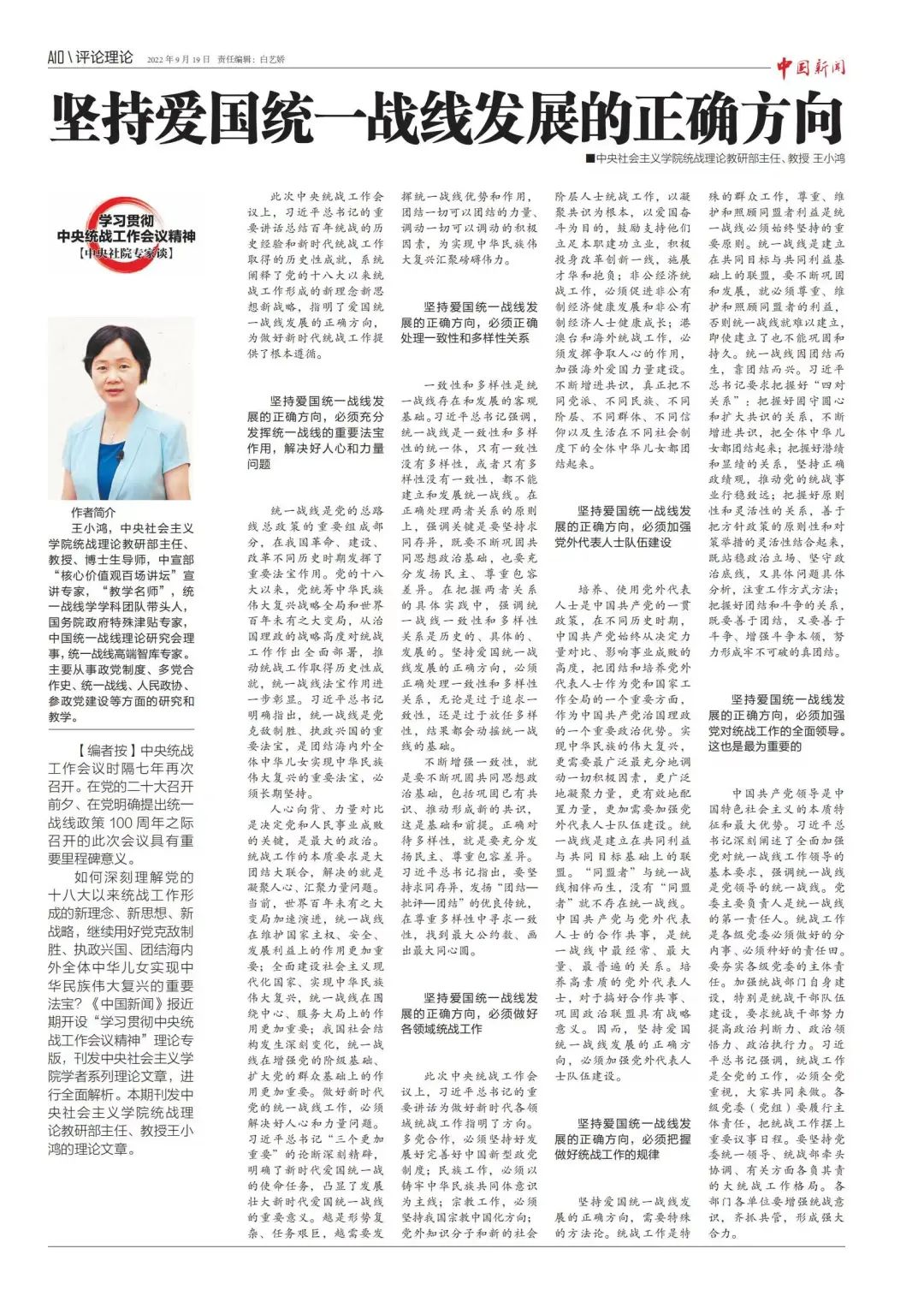 如何深刻理解党的十八大以来统战工作形成的新理念、新思想、新战略,继续用好党克敌制胜、执政兴国、团结海内外全体中华儿女实现中华民族伟大复兴的重要法宝?《中国新闻》报近期开设“学习贯彻中央统战工作会议精神”理论专版,刊发中央社会主义学院学者系列理论文章,进行全面解析。本期刊发中央社会主义学院统战理论教研部主任、教授王小鸿的理论文章。