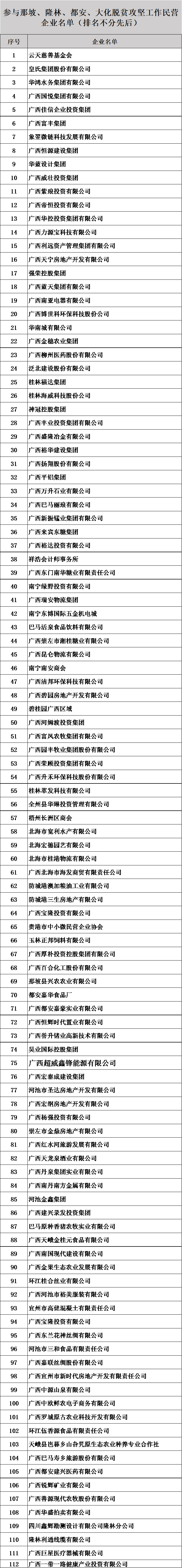 2018年以来,广西自治区党委统战部、广西光彩事业促进会多次组织全区民营企业积极参与那坡、隆林、都安、大化4个极度贫困县的深度贫困村结对帮扶工作,在助推极度贫困地区脱贫攻坚工作中发挥了积极作用。为树立典型,自治区党委统战部、广西光彩事业促进会决定于2019年底表扬一批在结对帮扶工作中表现突出的民营企业。现将企业名单公示如下,公示期为5天。如对公示内容有异议,可以电话或书面形式进行反馈。