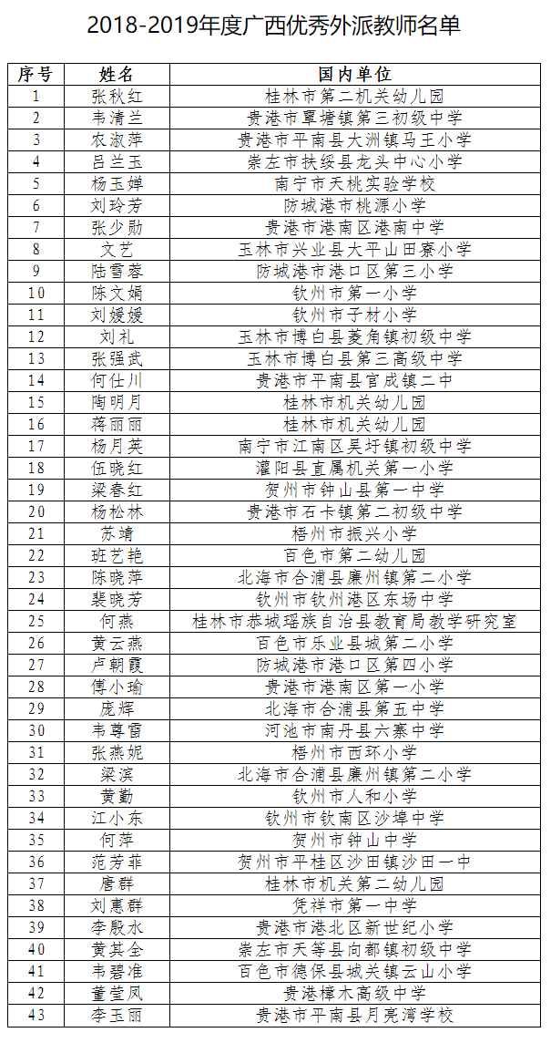 为表扬先进,增强外派教师的责任感、使命感和荣誉感,充分调动外派教师工作积极性,根据《广西区外派教师评优方案(试行)》,拟评选张秋红等43名教师为2018—2019年度“广西优秀外派教师”,具体名单附后。